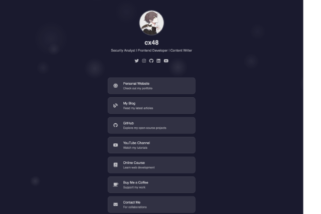 A simple, Tailwind-powered Linktree-style Hugo theme with profile, messaging, About and link cards.
